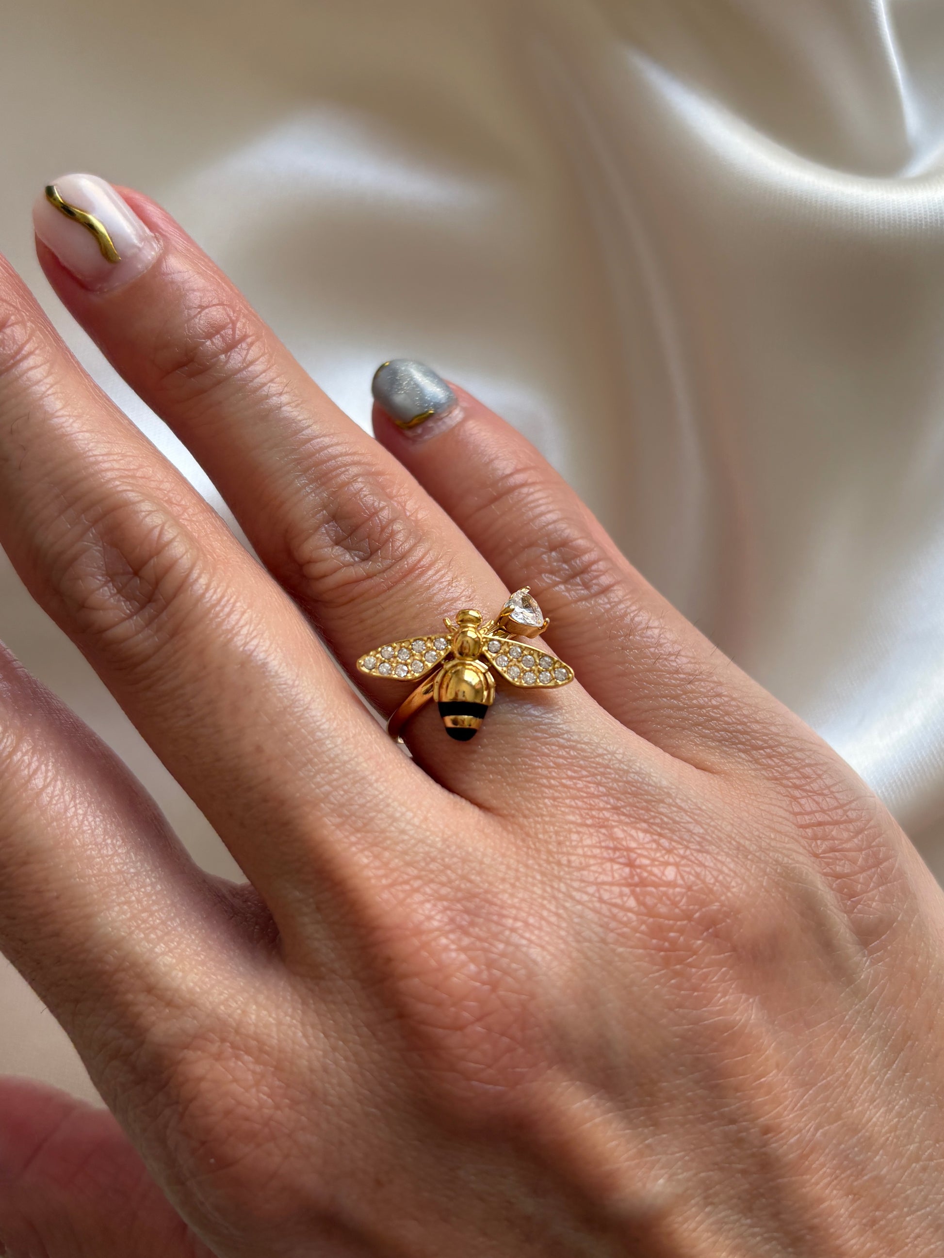 Anillo de titanio 18K waterproof e hipoalergénico, con diseño de abeja adornada con circonias en las alas y una circonia central en forma de corazón.