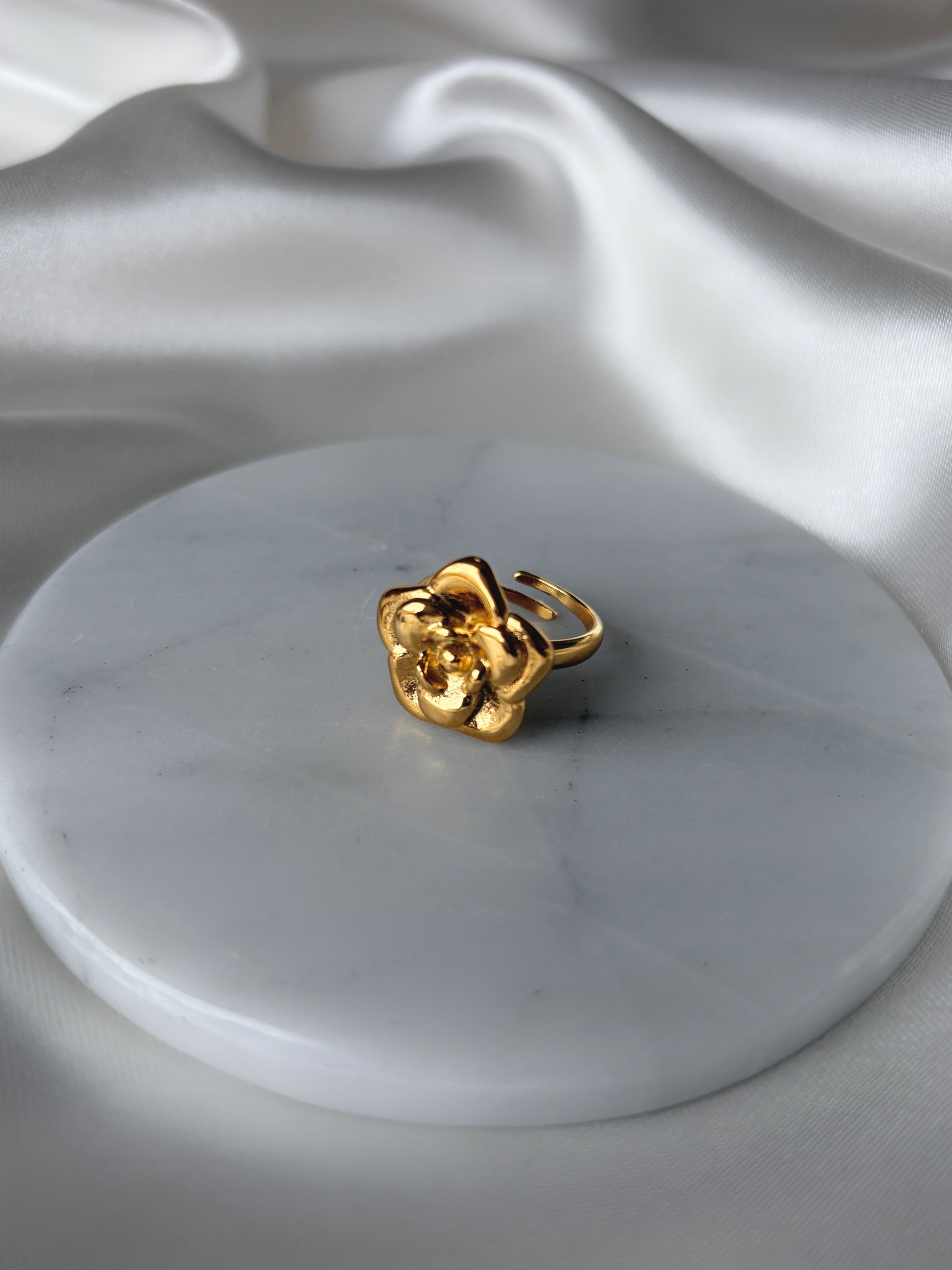 Anillo de titanio 18k waterproof e hipoalergénico con una flor grande al centro.