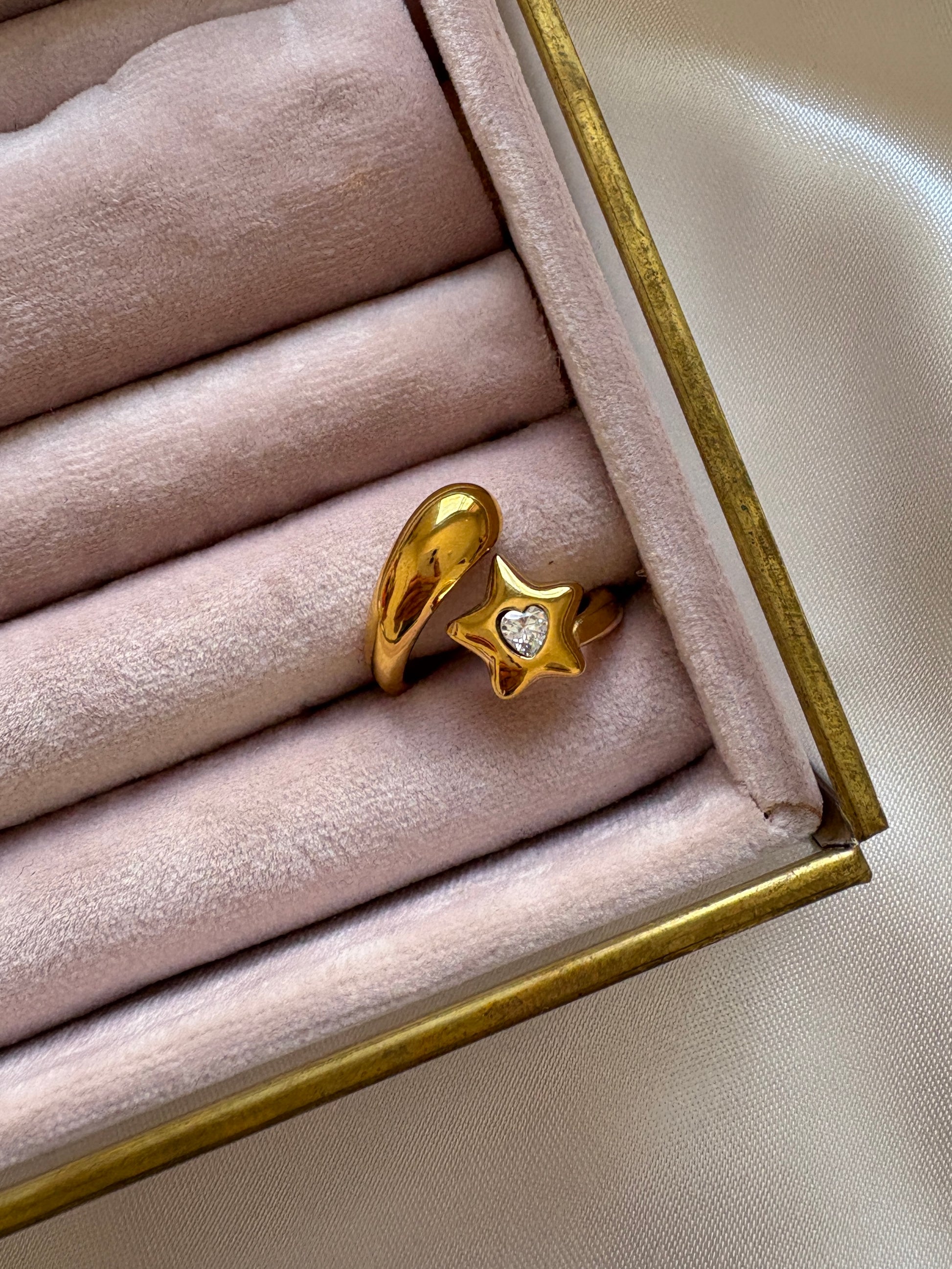 Anillo de titanio 18k waterproof e hipoalergénico, con diseño que va de grueso a delgado. Termina en una estrella con una delicada circonia en forma de corazón.