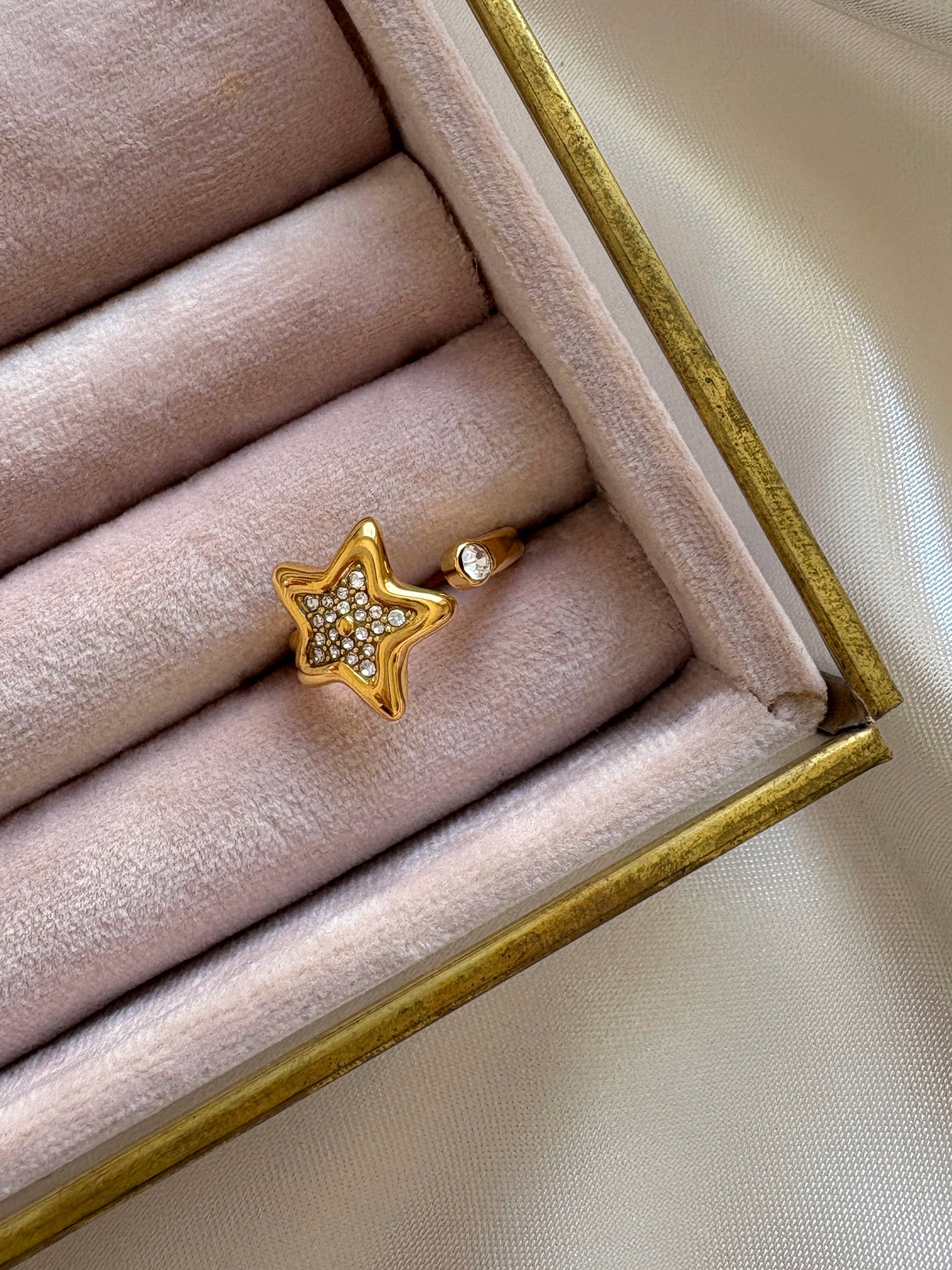 Diseño con una estrella decorada con delicadas circonias y un brillante punto central de circonia.