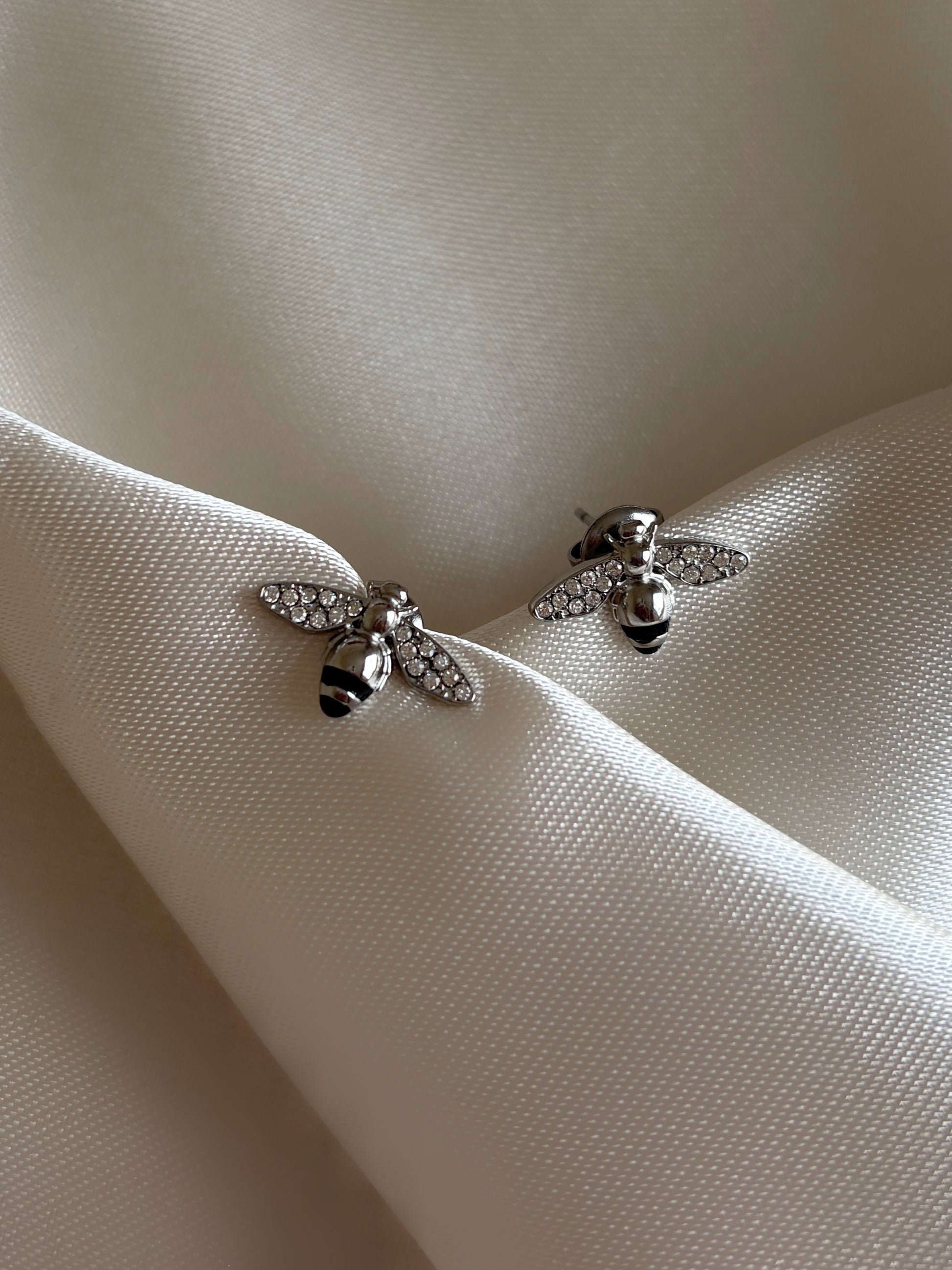 Aretes de titanio 18K waterproof e hipoalergénicos con diseño de abejas y circonias en las alas.
