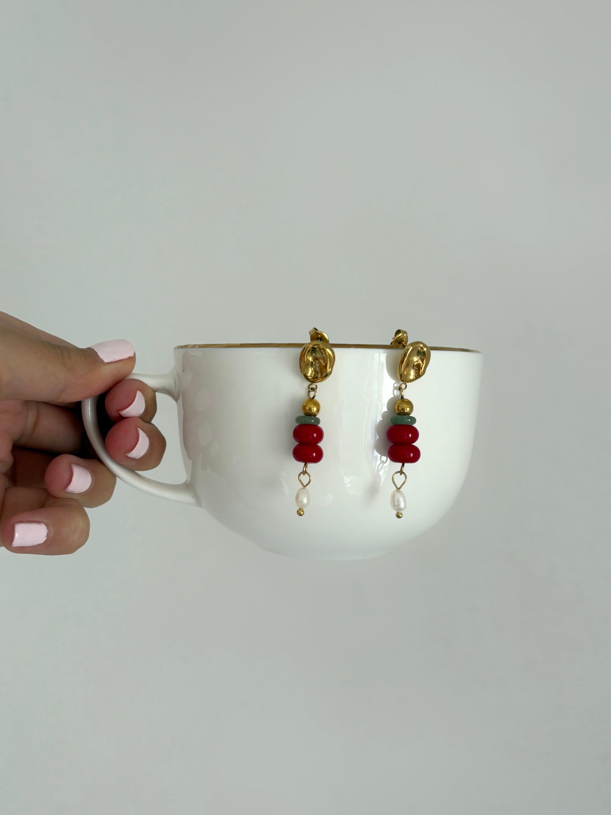 Aretes artesanales de titanio 18K, waterproof e hipoalergénicos, con piedras natutales rojas, verdes y perlas, ideales para pieles sensibles.