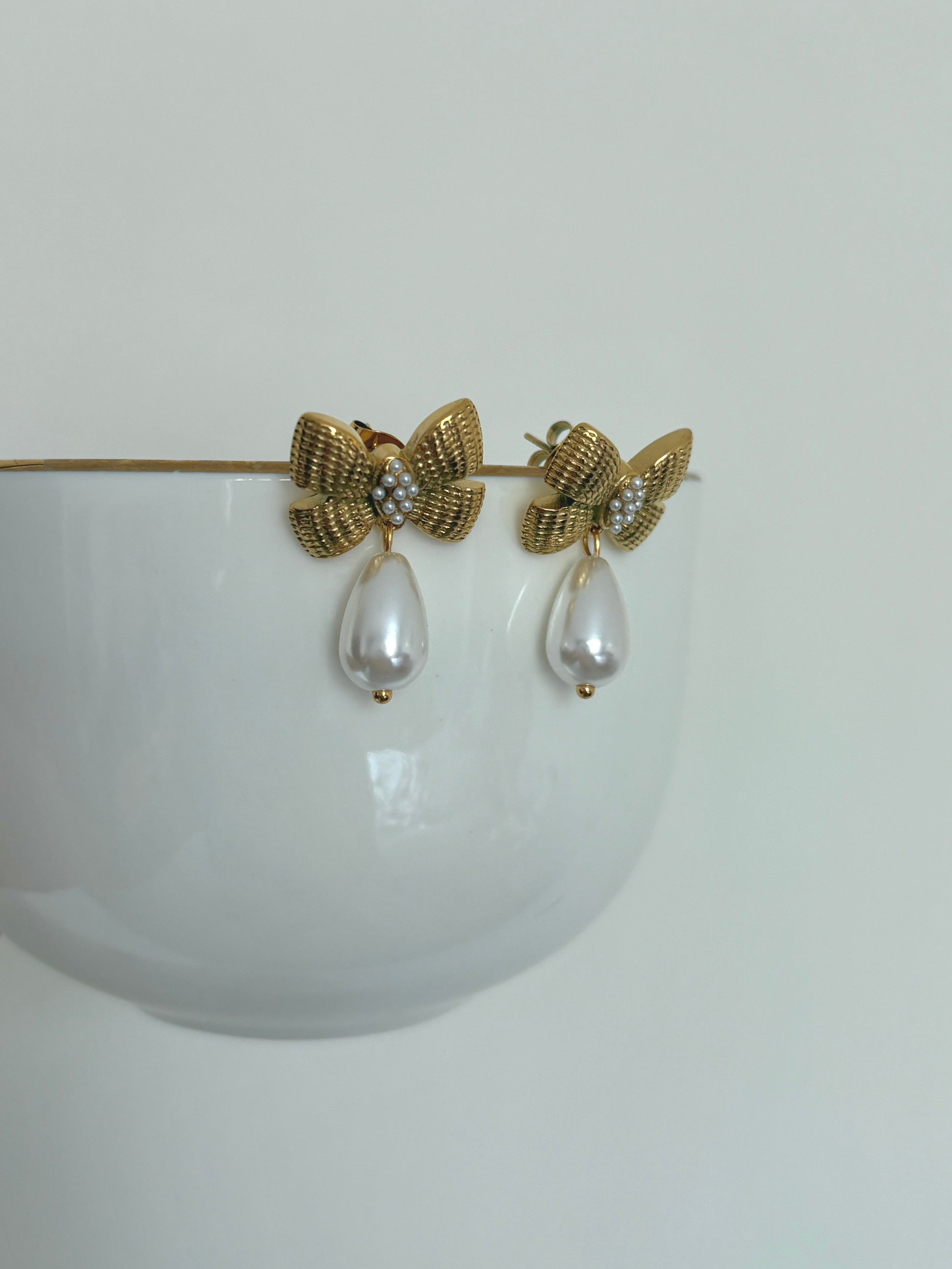 Aretes de titanio 18K waterproof e hipoalergénicos con moño texturizado, perlitas centrales y perla artificial en forma de gota colgante.