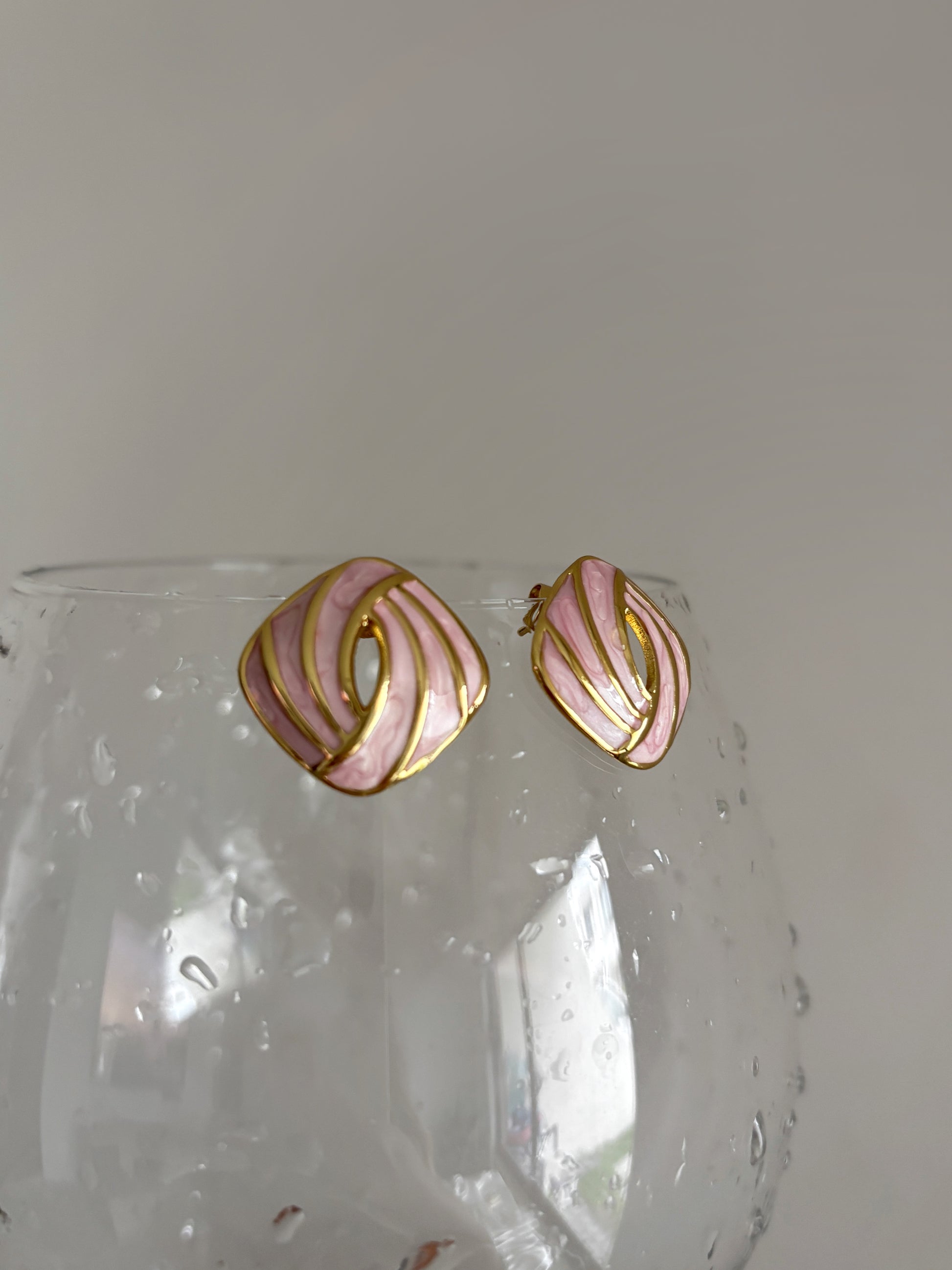 Aretes de titanio 18K, waterproof e hipoalergénicos, en forma cuadrada, esmaltados en color rosa y detalles en dorado, ideales para pieles sensibles.
