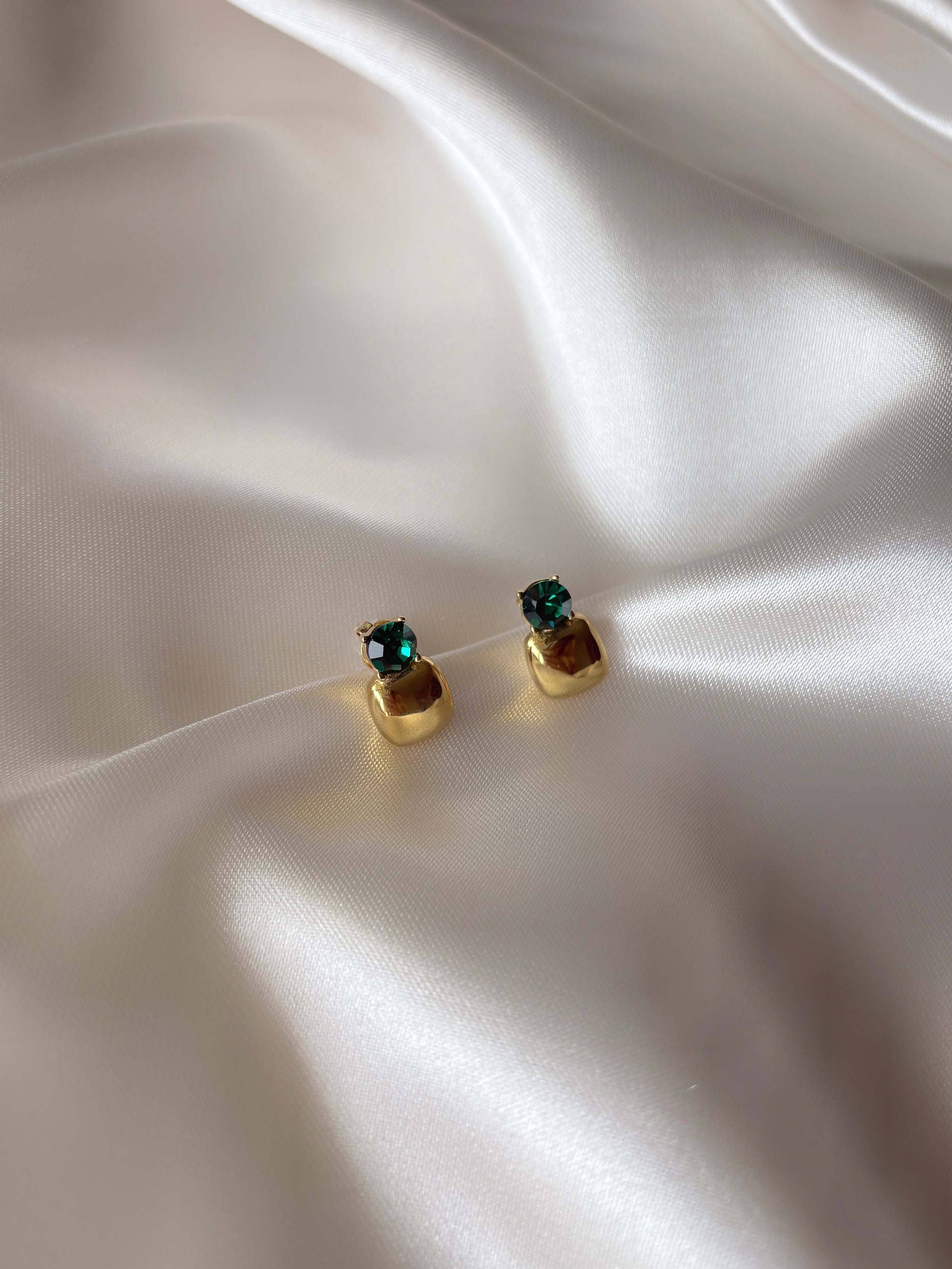 Aretes de titanio 18K, waterproof e hipoalergénicos, con incrustación de cristal color verde esmeralda, ideales para pieles sensibles.