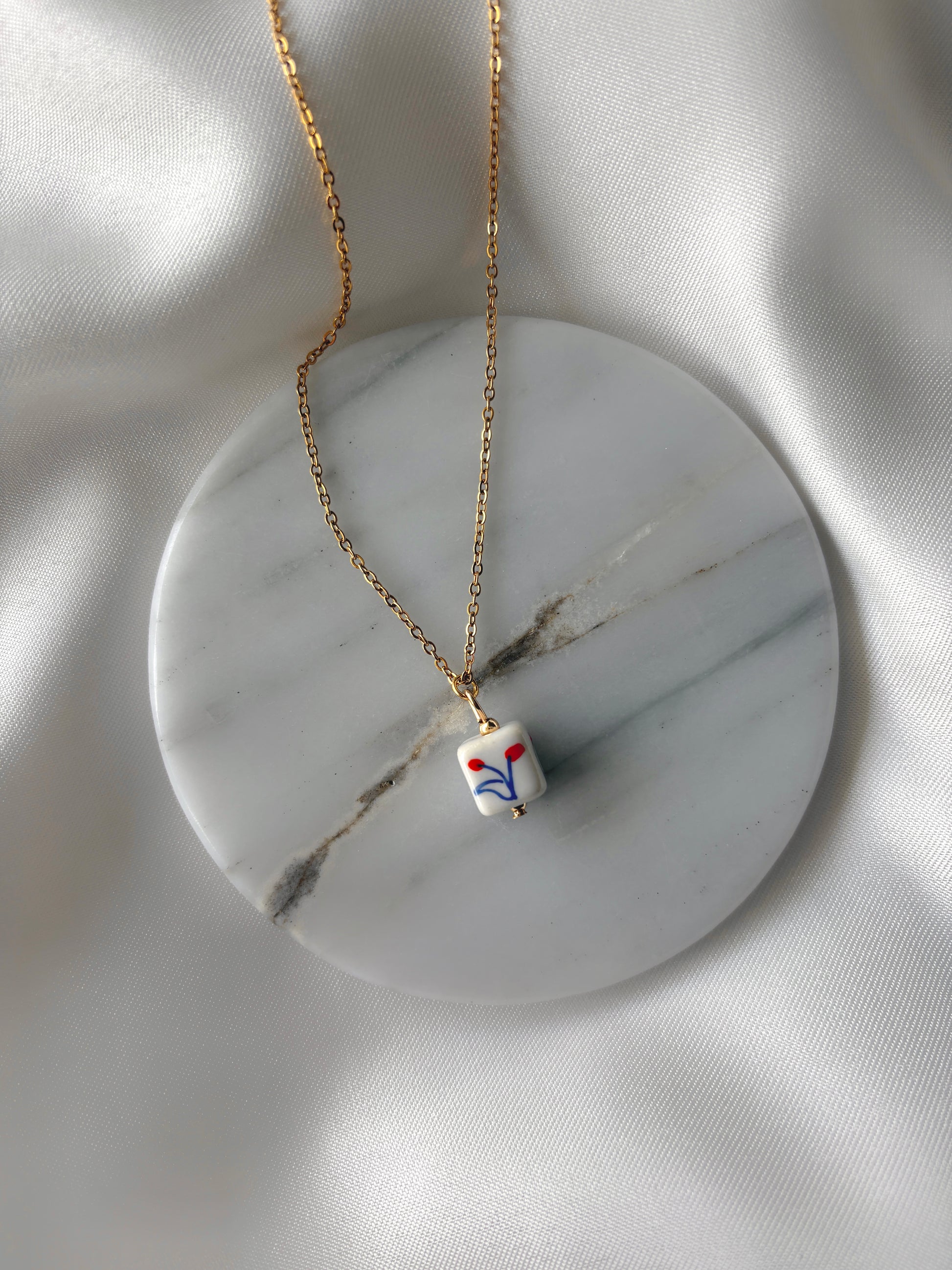 Resistente cadena de titanio 18k waterproof e hipoalergénica con dije cubo de resina pintada.