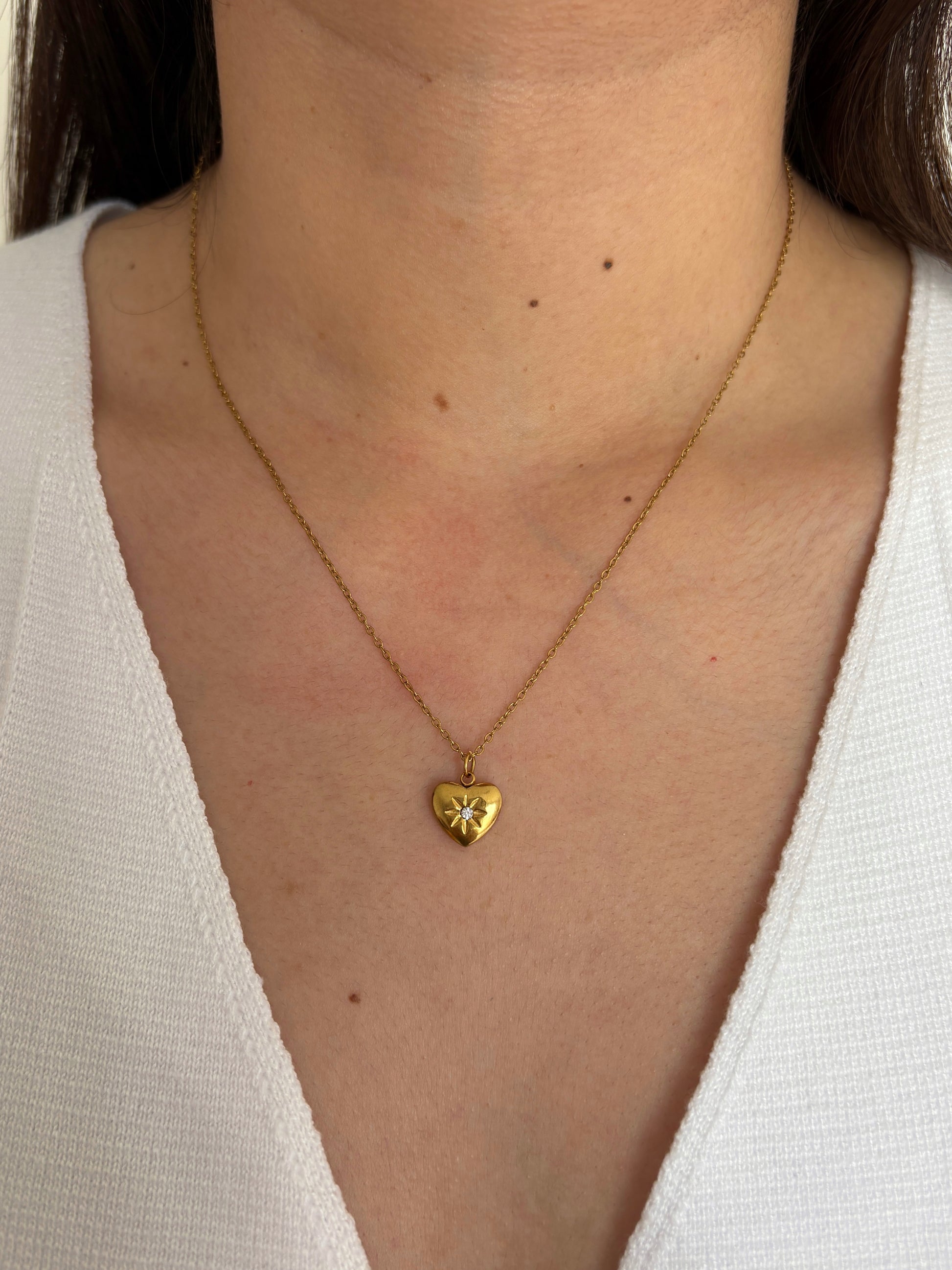 Collar en titanio 18k waterproof e hipoalergénico con dije en forma de corazón bombachito, con estrella en relieve en el centro y circonia pequeña en el medio. Medidas: 40 cm + 5 cm de extensión.