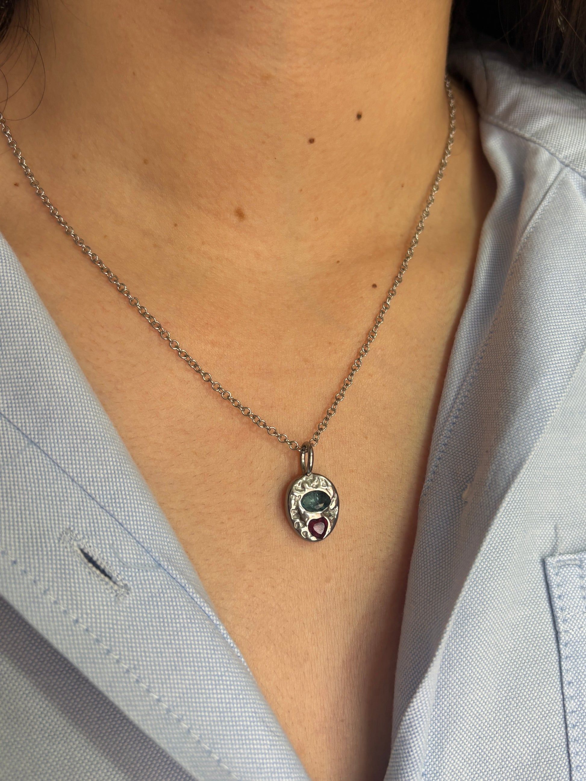 Collar montado en titanio puro waterproof e hipoalergénico con dije tipo moneda irregular en titanio puro, con dos zirconias al centro: una ovalada en azul y otra en forma de corazón en rosa.