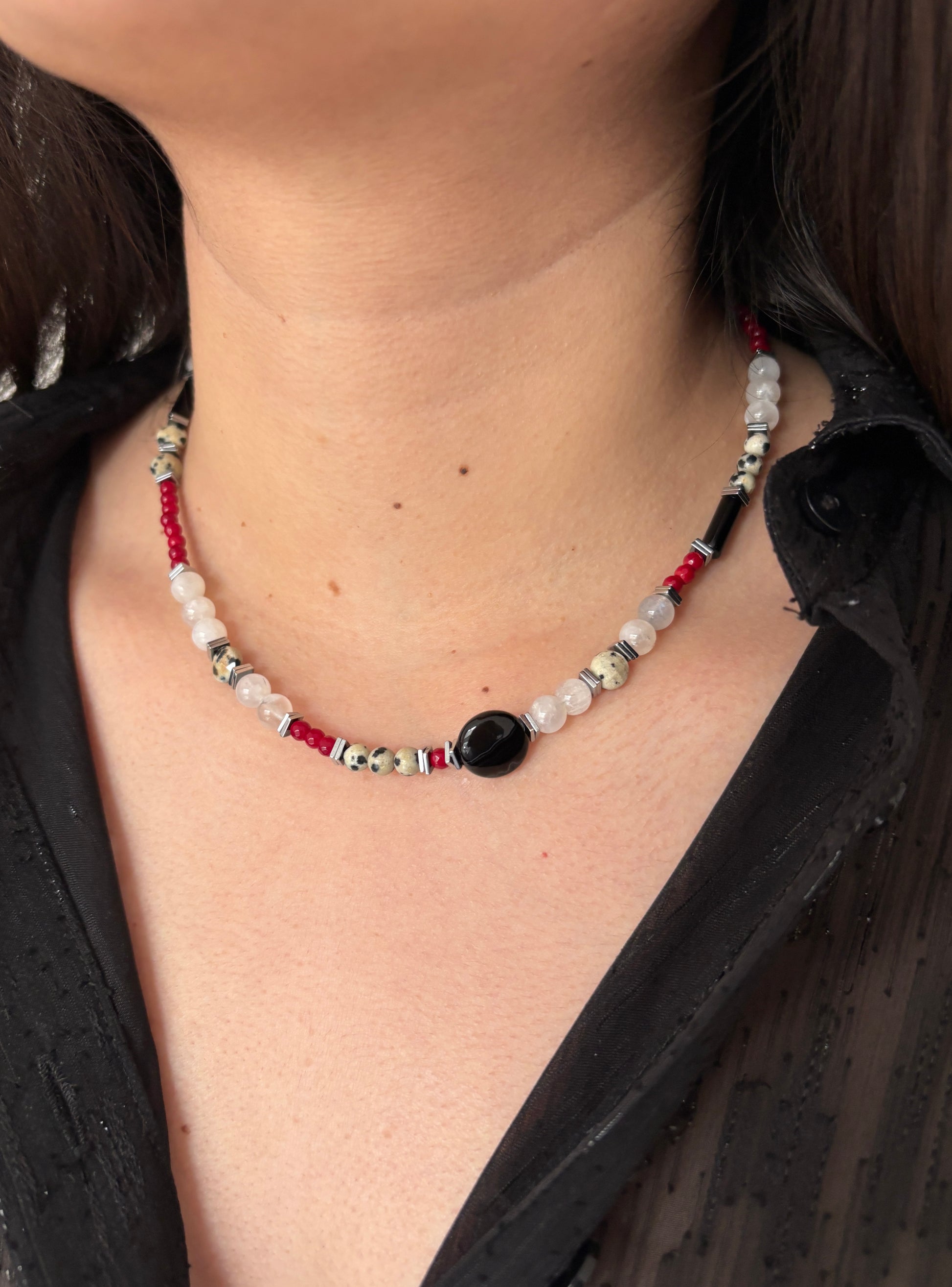 Armado en ágatas rojas, piedra lunar, jaspe dálmata, ónix y hematitas plateadas.