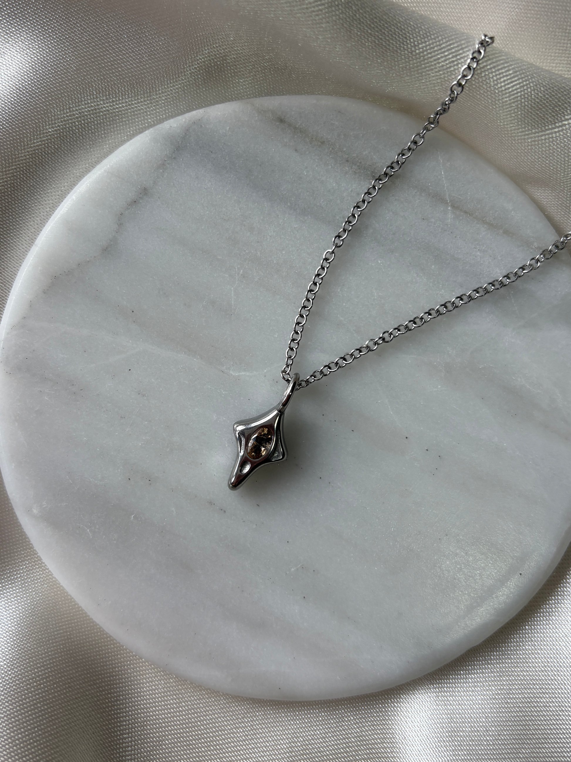 Collar montado en titanio puro waterproof e hipoalergénico con dije tipo destello alargado en titanio puro y zirconia ovalada en tono champán al centro.