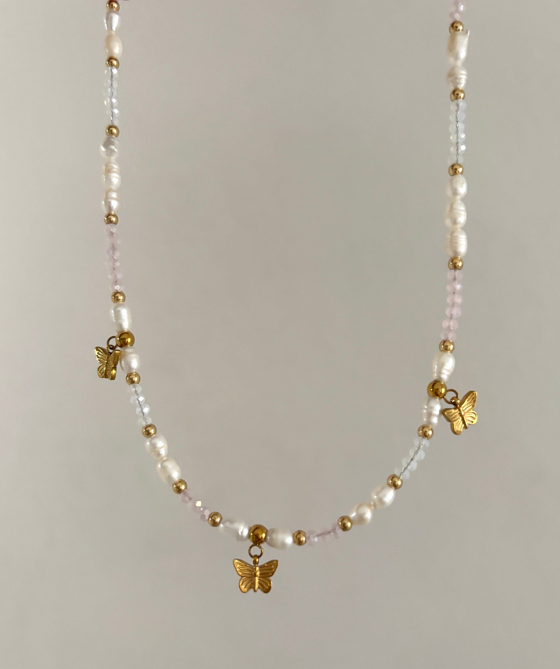 Diseñado con perlas naturales, cristales rosa bebé, cristales blancos y separadores metálicos. Como toque especial, lleva tres dijes de mariposa en titanio.