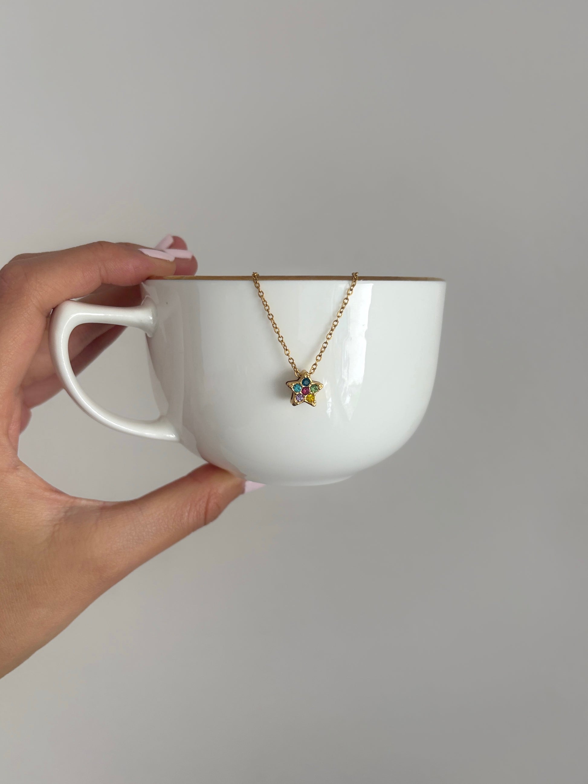 Resistente cadena de titanio 18k waterproof e hipoalergénica con delicado dije de estrella decorada con coloridas incrustaciones de circonias.