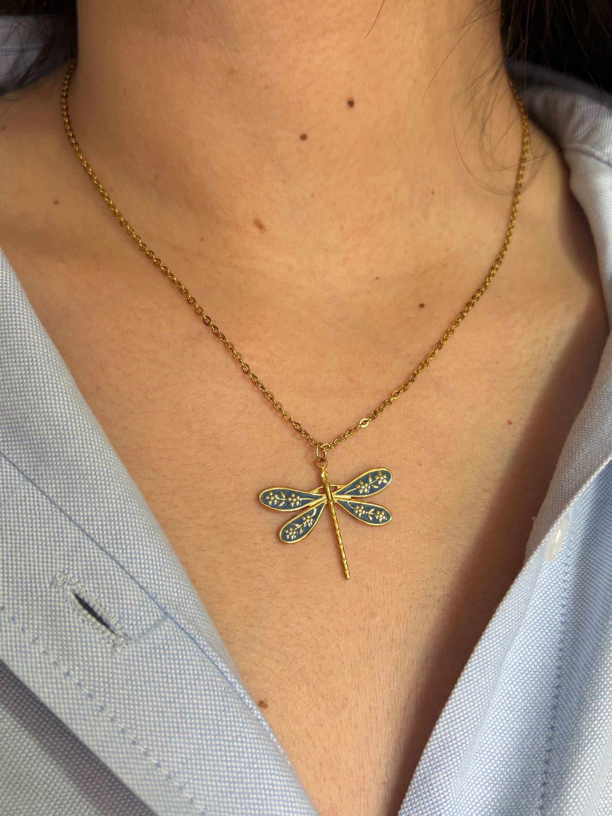 Collar montado en titanio 18k waterproof e hipoalergénico con dije de libélula cuyas alas están decoradas con flores.