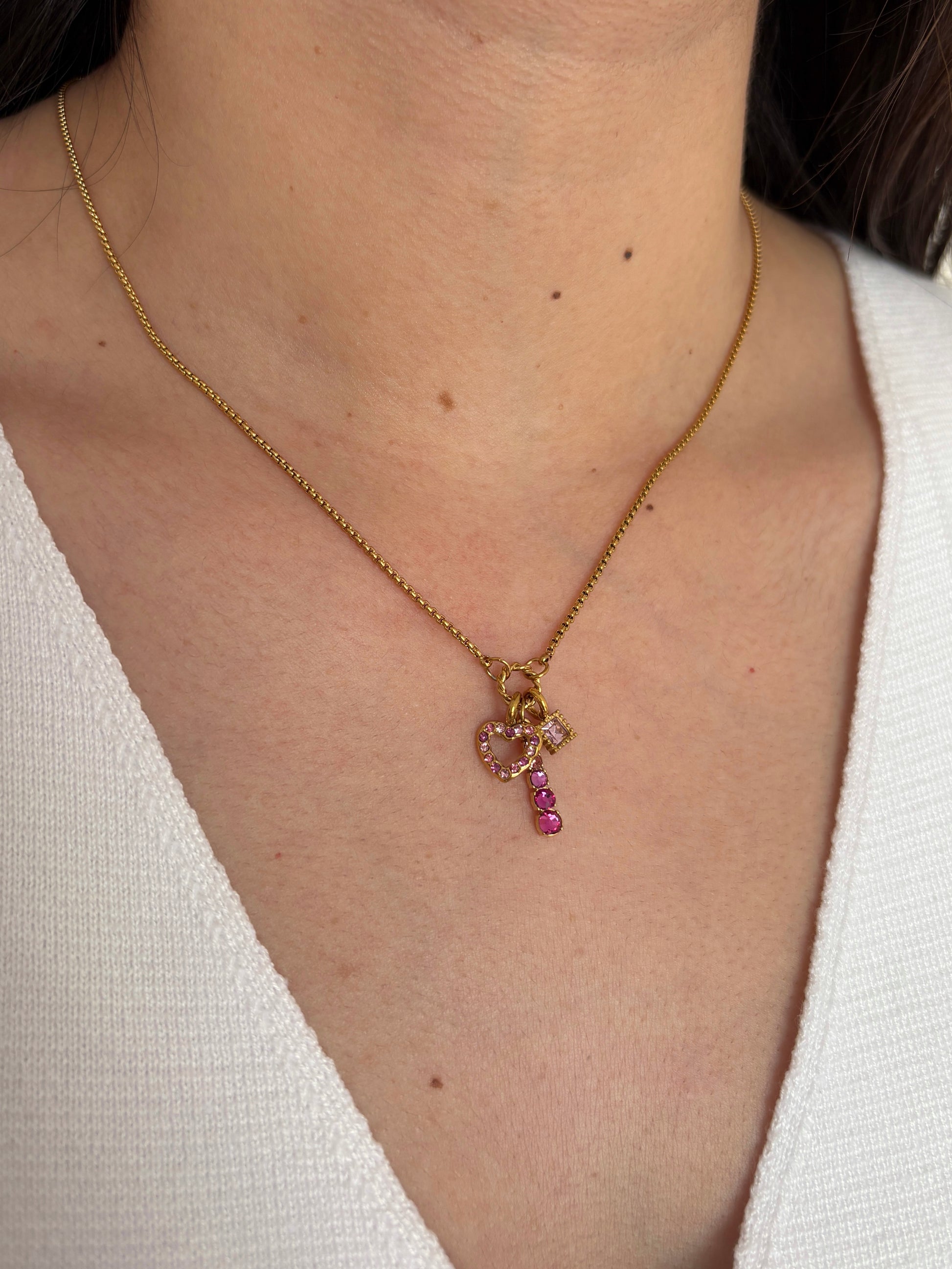 Collar en titanio 18k waterproof e hipoalergénico con cadena de estilo rolo y tres dijes al centro: corazón con circonias rosas, triángulo con circonias en distintos tonos de rosa y cubo con circonia rosa clara. Medidas: 40 cm + 5 cm de extensión.
