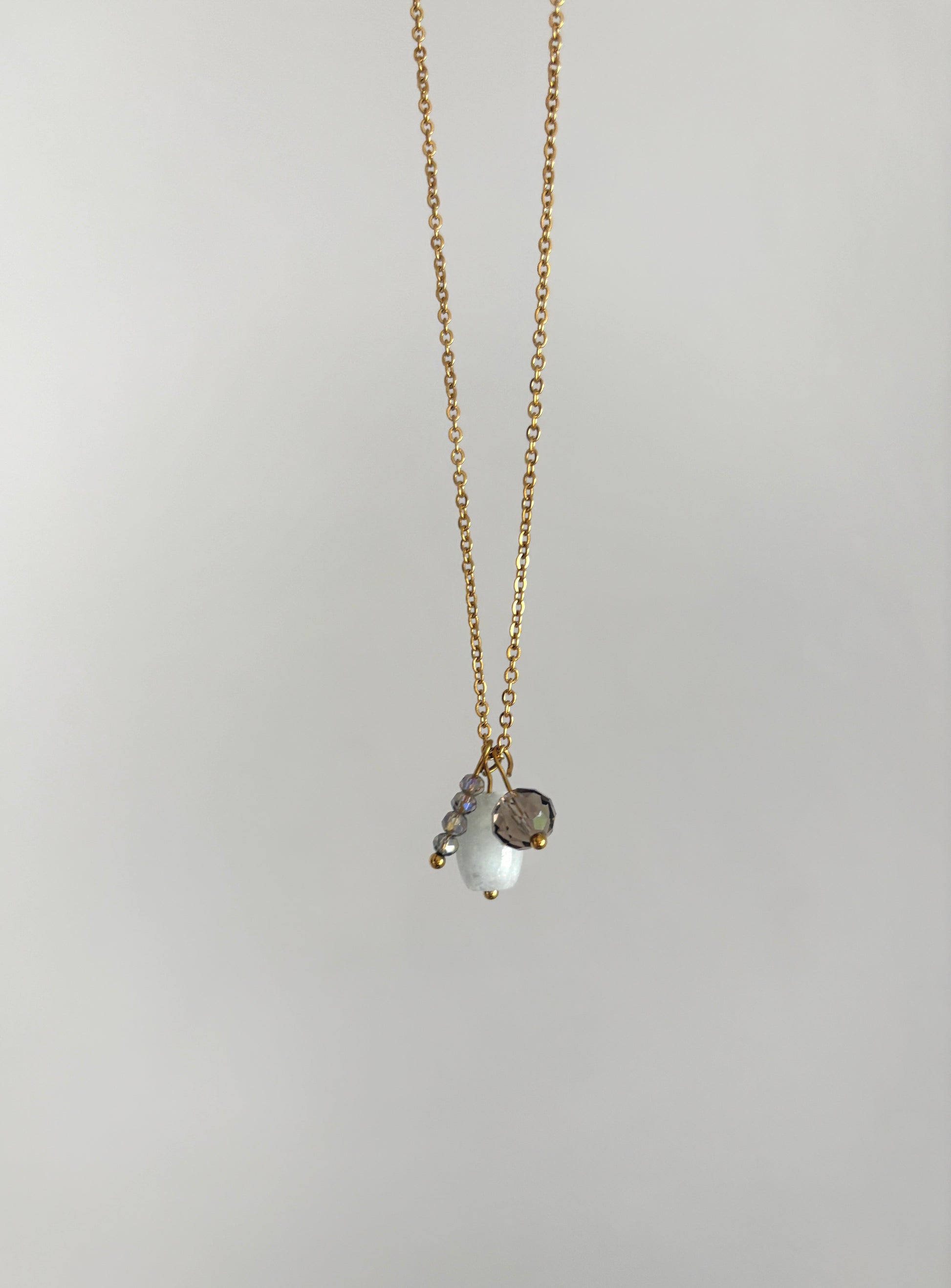 Resistente cadena de titanio 18k waterproof e hipoalergénica con dijes de ágata y cristales checos en tonos grises.