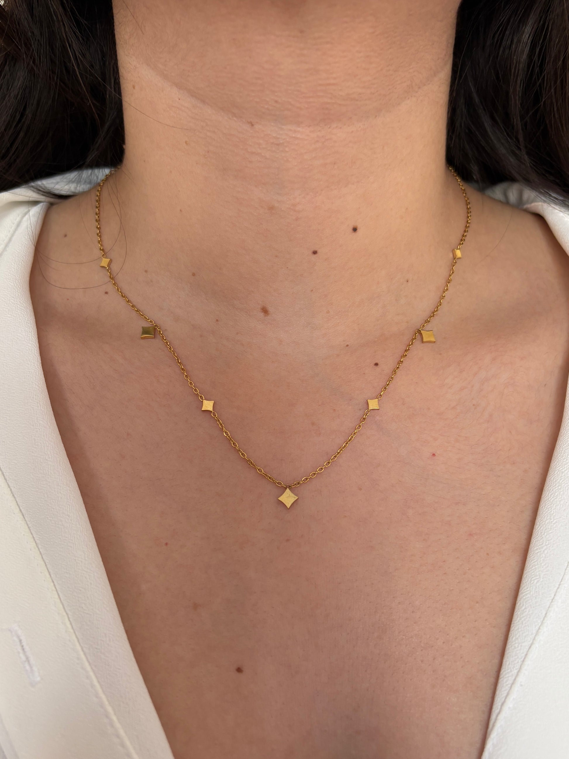 Fina cadena de titanio 18k waterproof e hipoalergénica con siete dijes en forma de rombo.