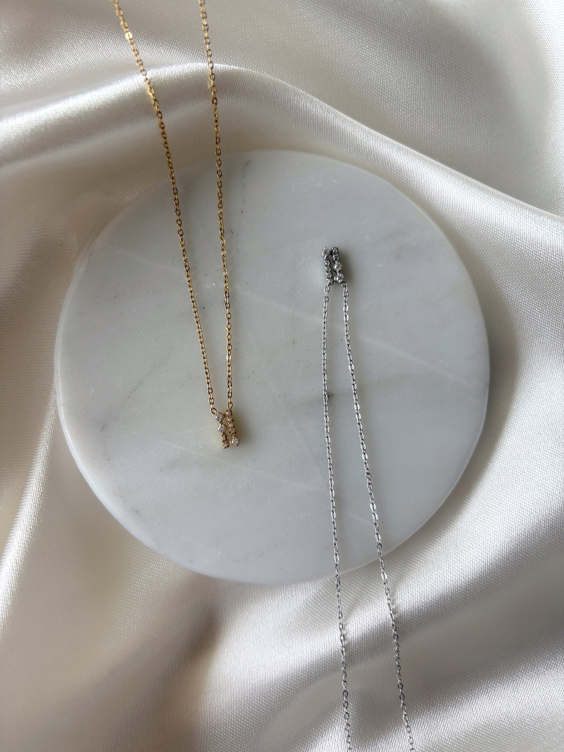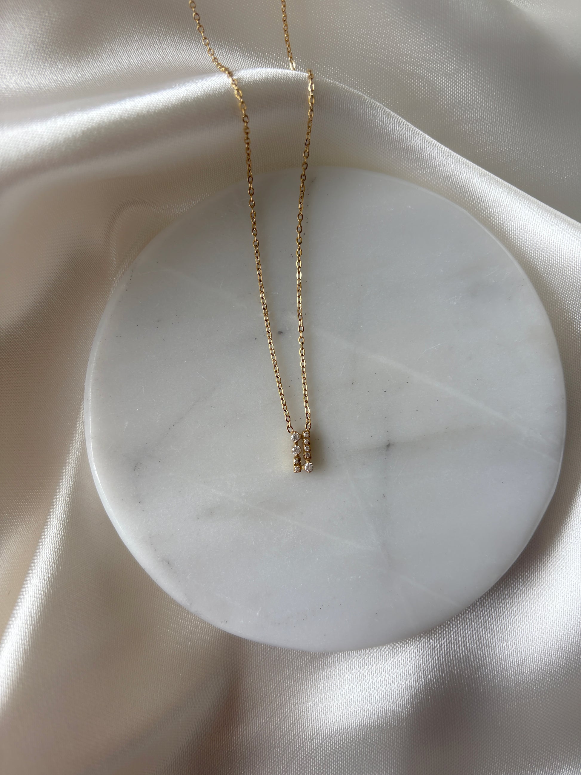 Delicada cadena de titanio 18k waterproof e hipoalergénica con fino dije rectangular decorado con circonias.