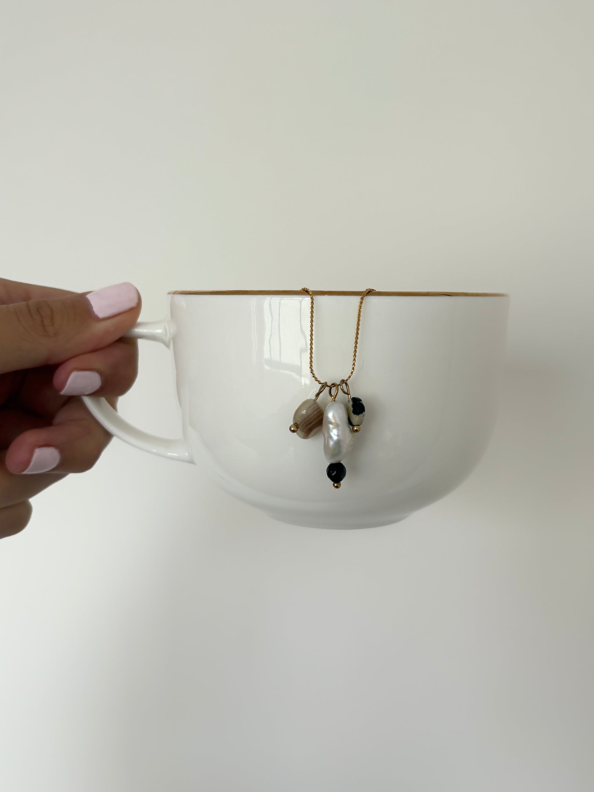 Delicada cadena de titanio 18k waterproof e hipoalergénica con dijes de ágata, jaspe dálmata y perla Keshi.