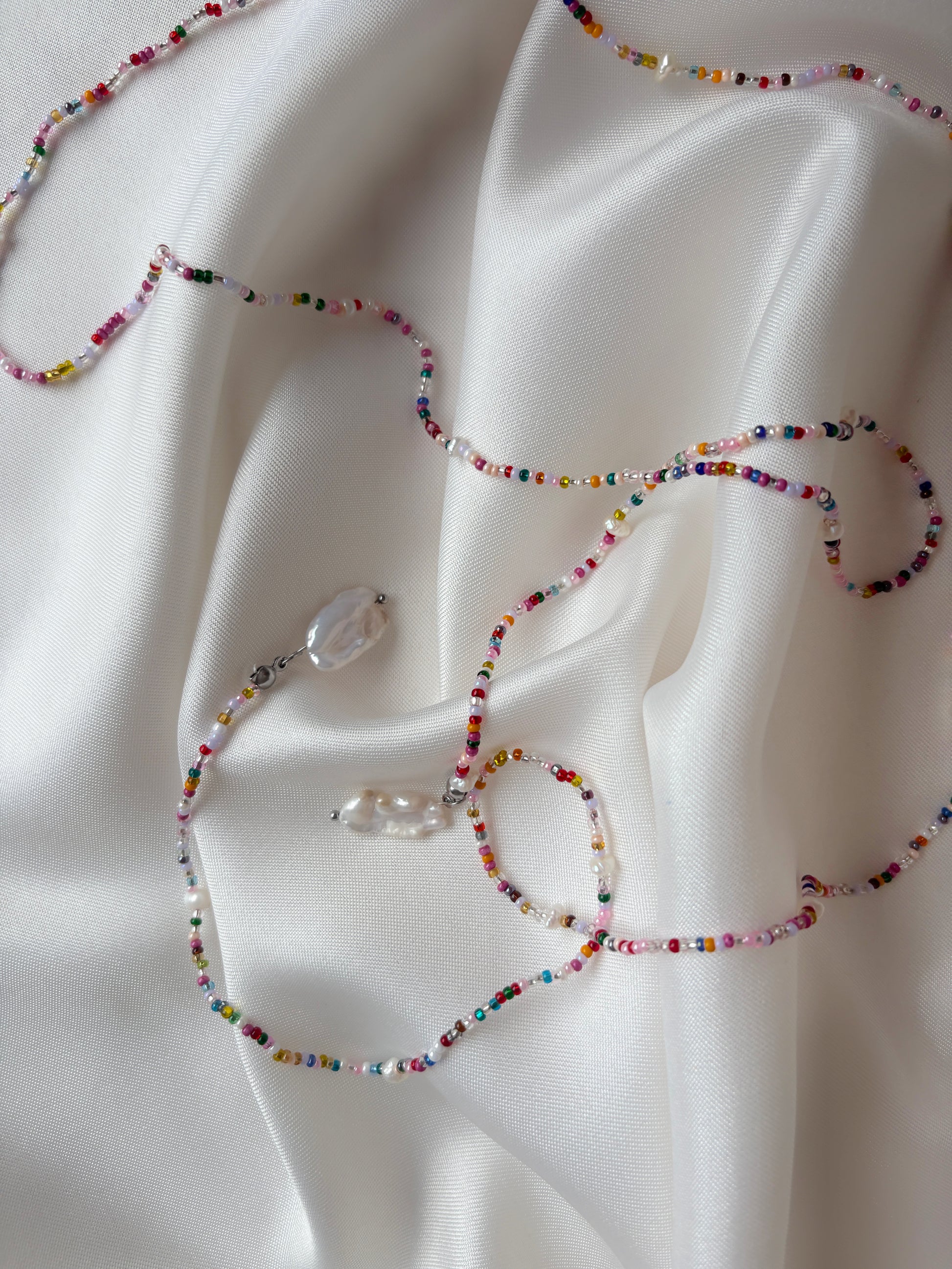 Collar hecho de coloridas chaquiras y perlas naturales; con dijes de perla keshi.