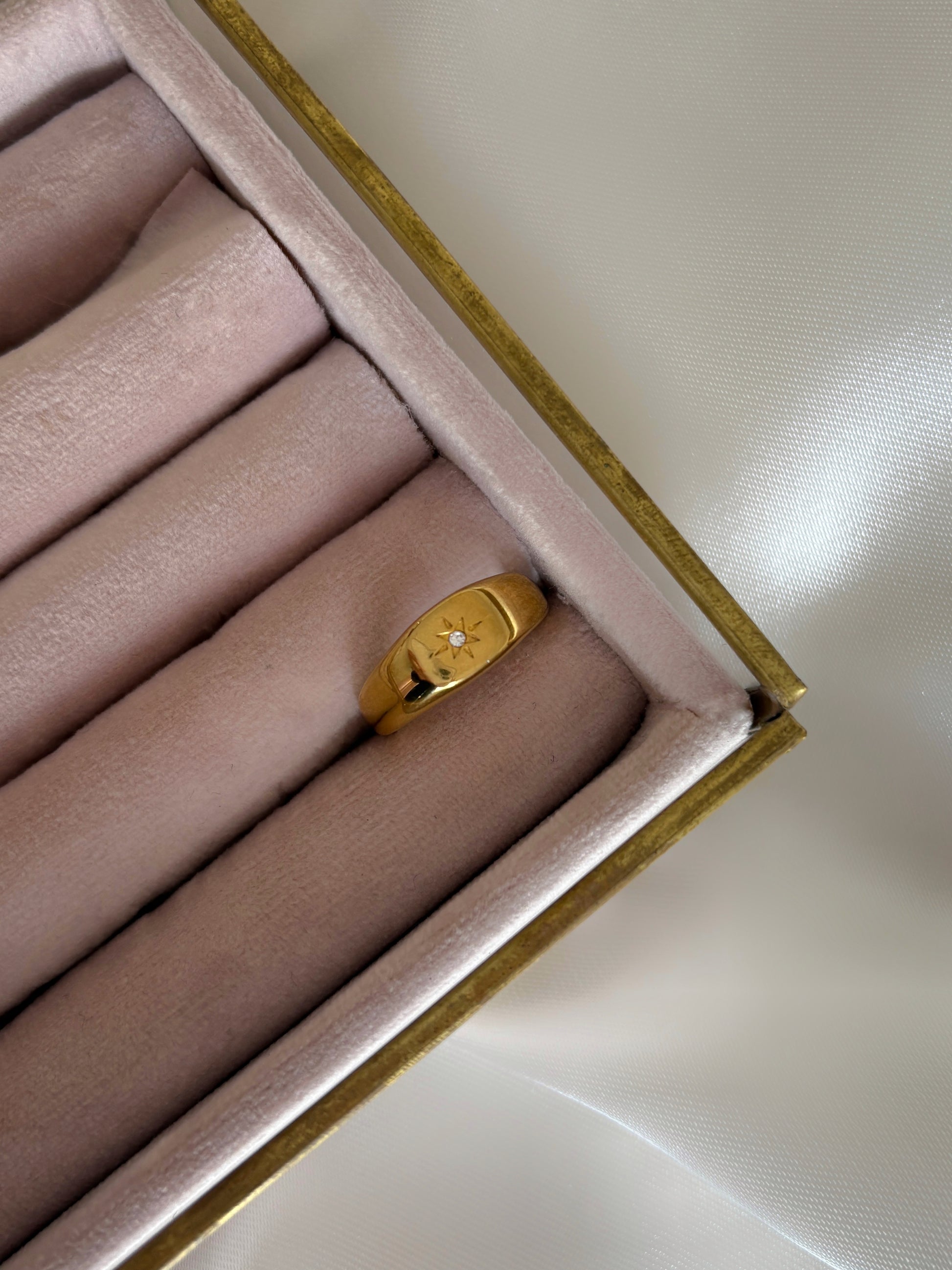 Anillo de titanio 18k waterproof e hipoalergénico, con grabado de estrella estilo miel y un punto de
