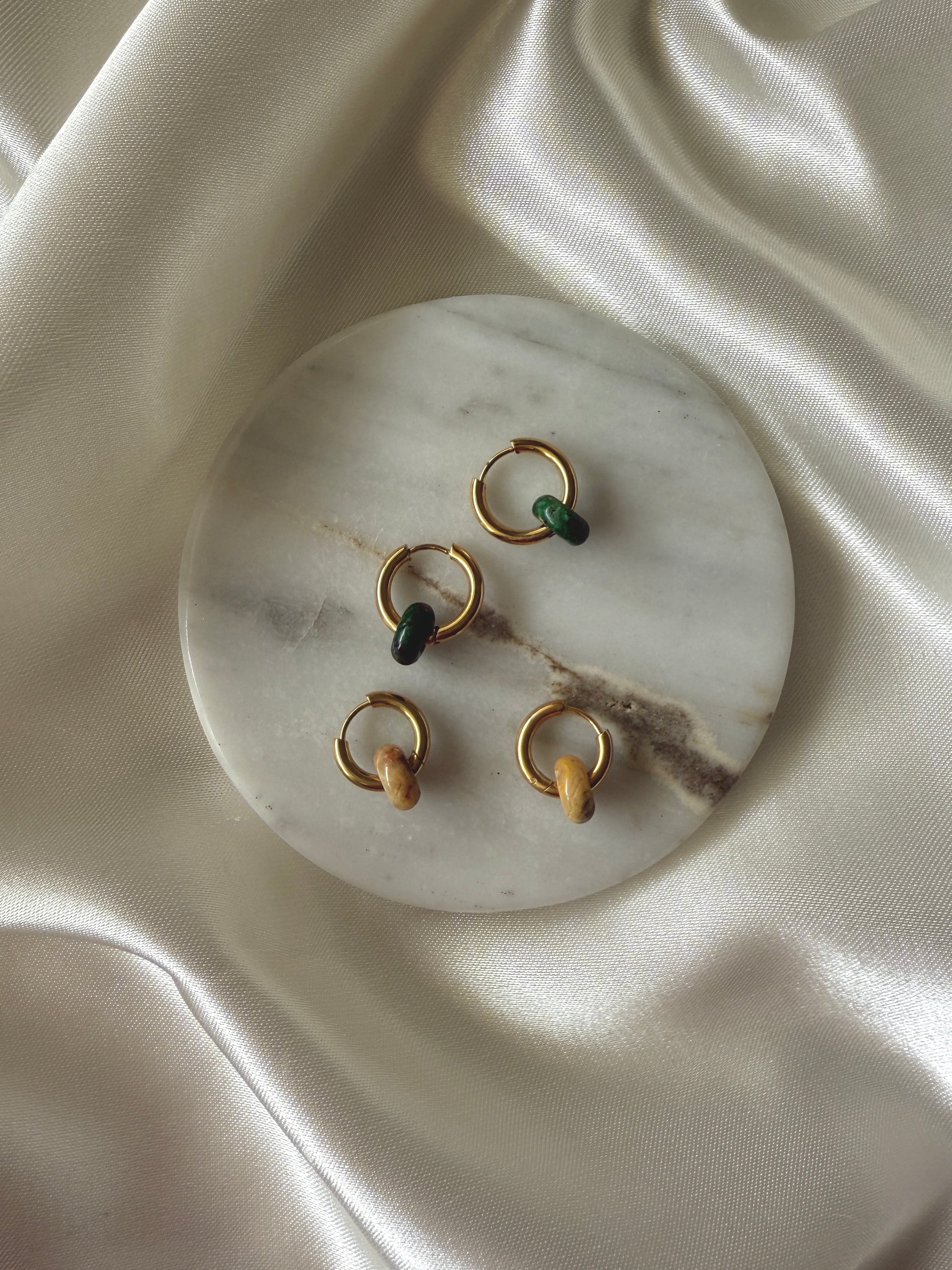 Hoop artesanales de titanio 18k waterproof e hipoalergénicos, especial para pieles sensibles con mini piedra natural.