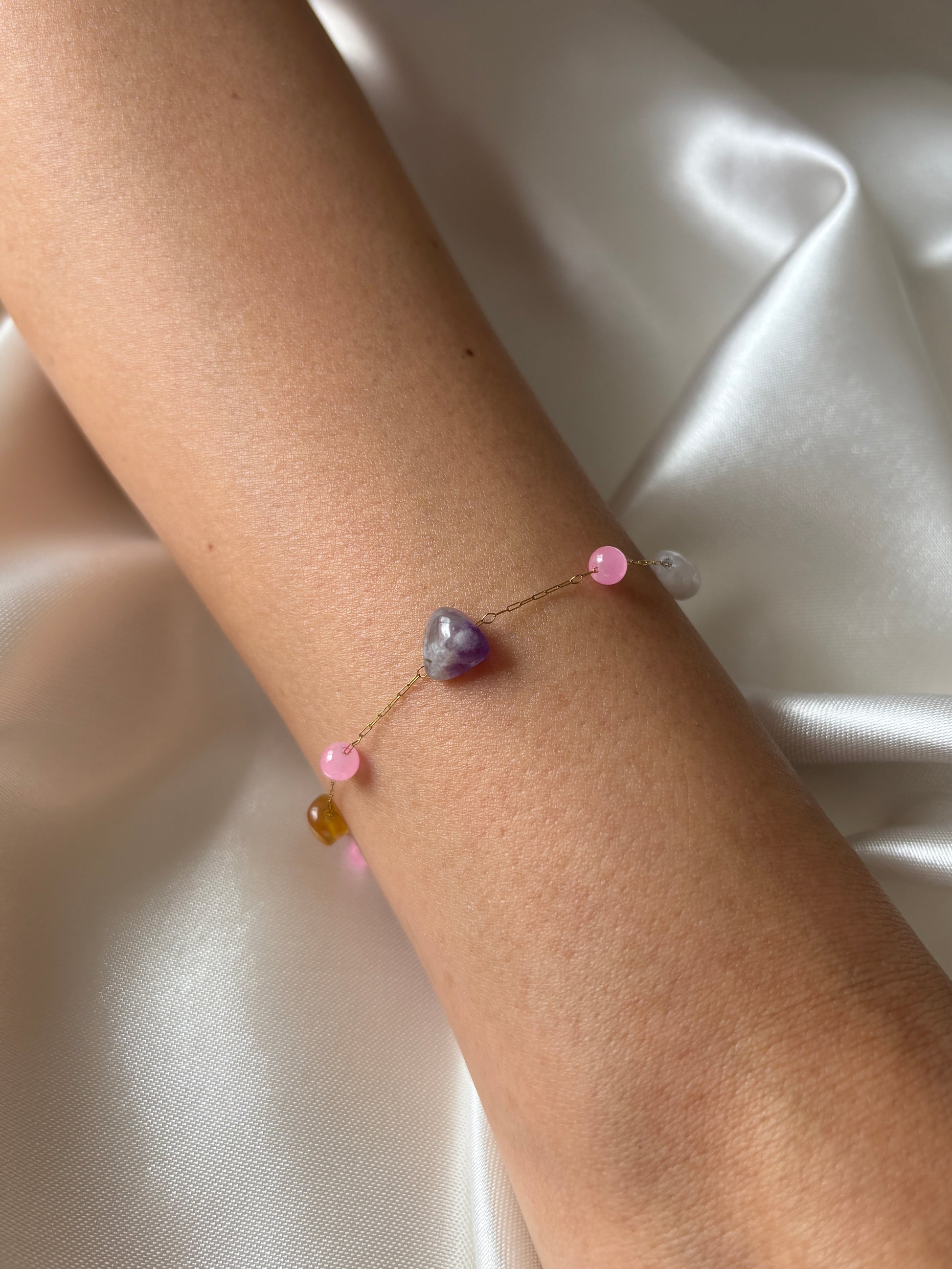 Delicada pulsera artesanal de titanio 18k waterproof e hipoalergénica, con ágata nugget, amatista, piedra amarilla y cristal rosa.