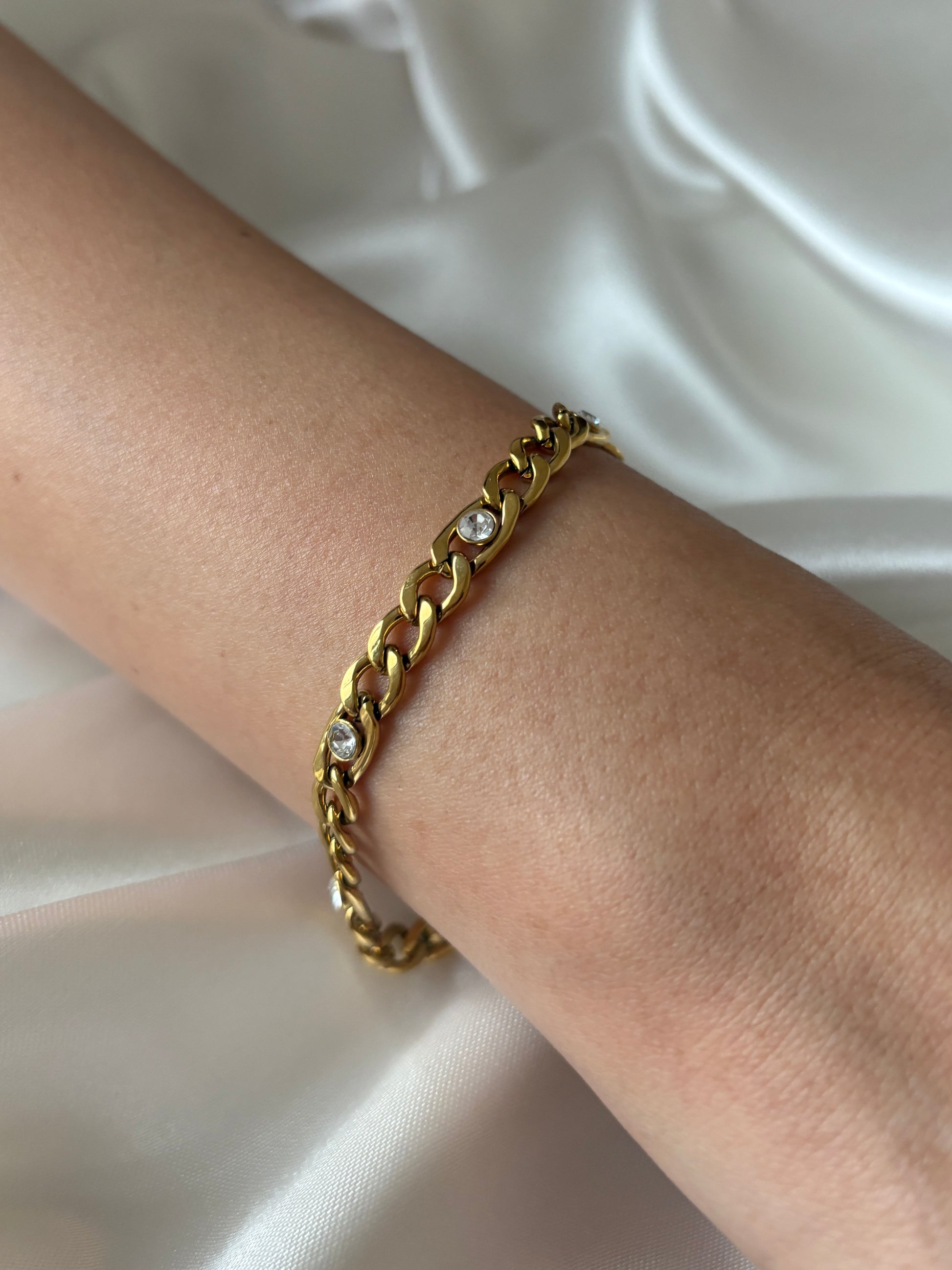 Elegante pulsera de titanio 18k waterproof e hipoalergénica, estilo curb con pequeños destellos.