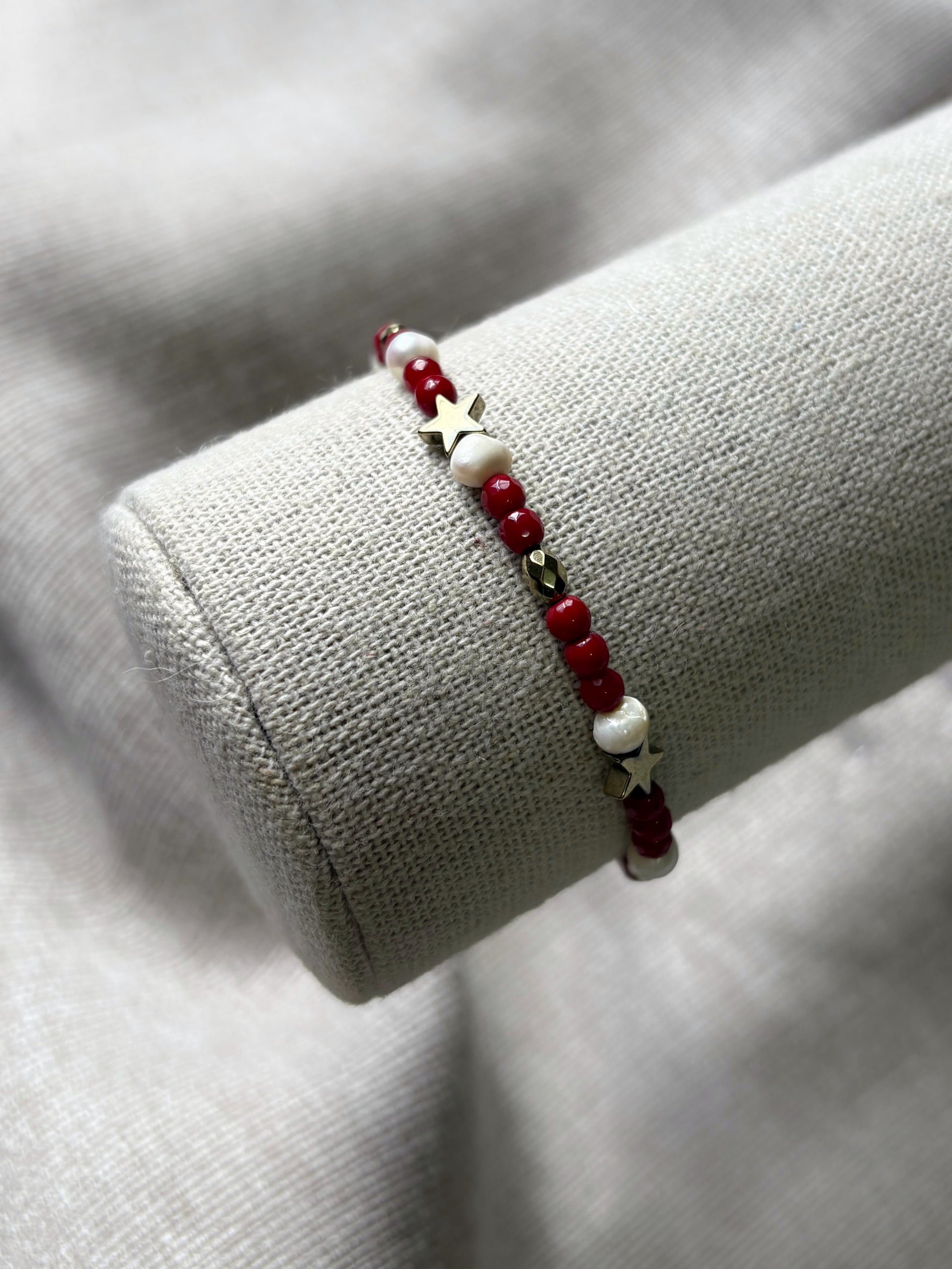 Pulsera artesanal montada en titanio waterproof e hipoalergénico con ágatas rojas, perlas naturales y detalles en matitas de titanio en forma de arroz y estrella en tono dorado.