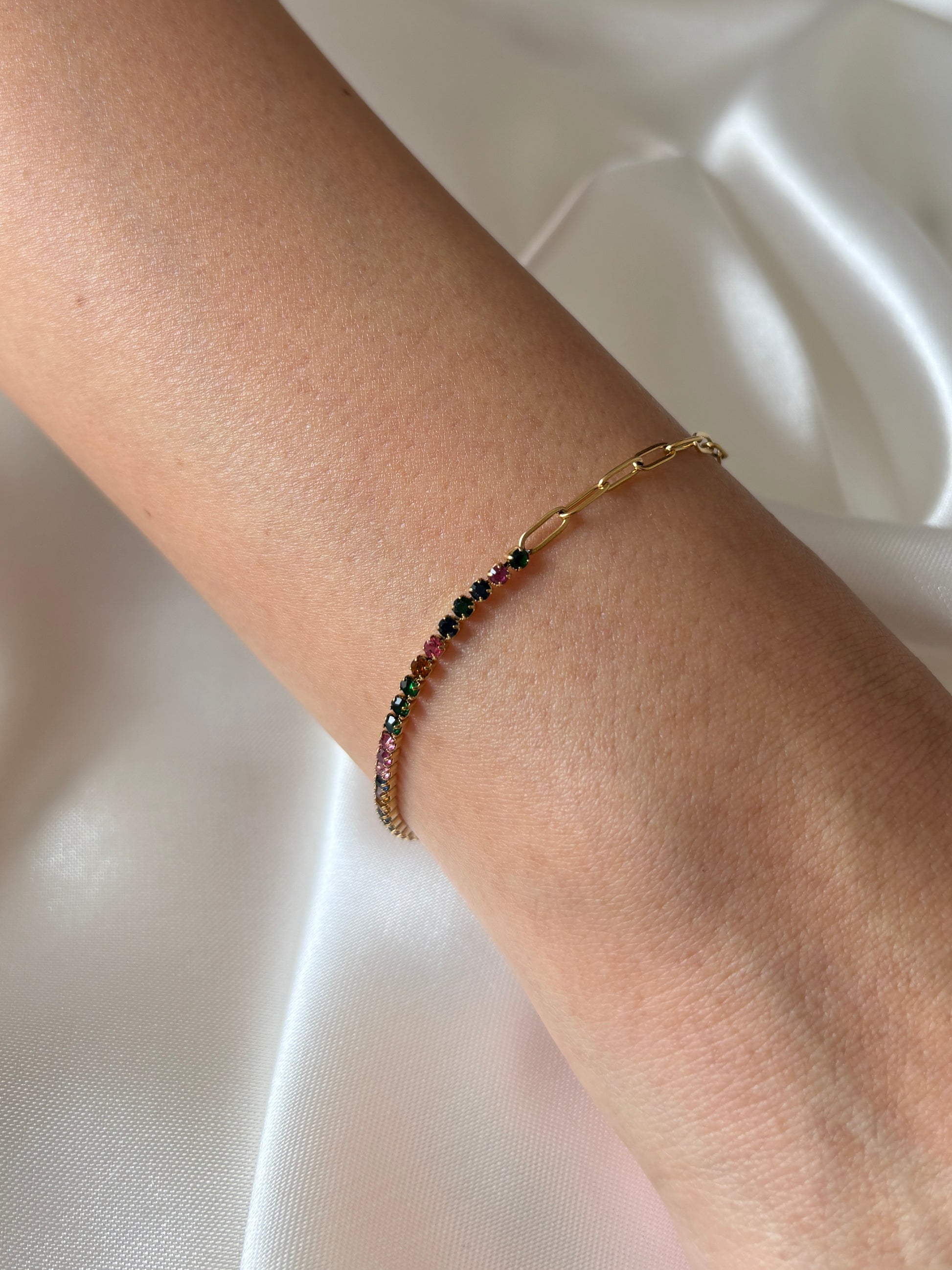 Diseño moderno de cadena que combina eslabones estructurados con coloridas circonias.